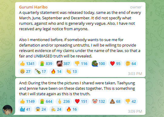 When the statement was made, many assumed it was aimed at Gurumi Haribo. However, users recently responded to the statement from Big Hit on the Telegram account. In response, this person explained that the company's quarterly announcement of legal action against BTS defamation acts. Not only that, Gurumi Haribo also confirmed that she did not receive any lawsuits and affirmed that she told the truth.