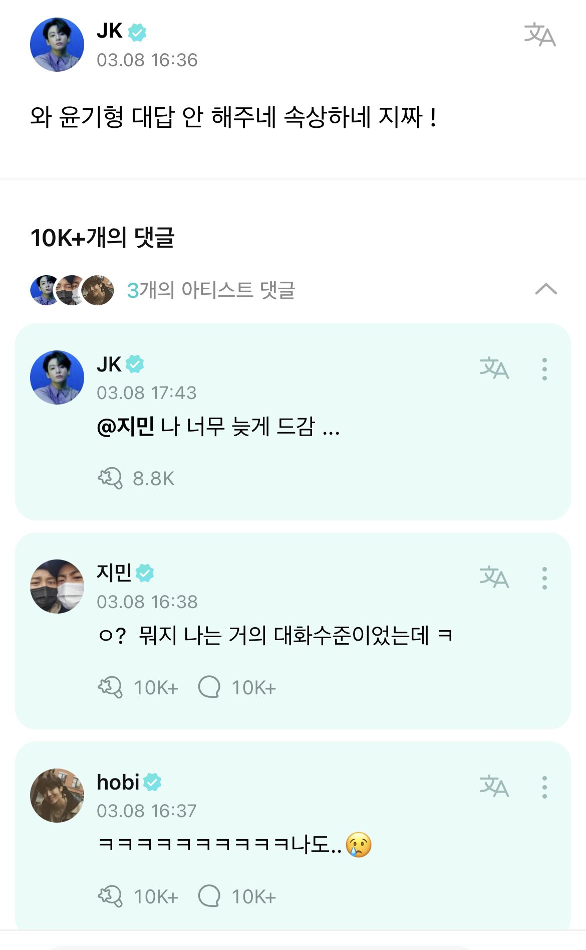 Jungkook wrote on Weverse that: "Wow Yoongi hyung, didn’t even answer my comment this is super upsetting btw !" and j-hope seems to understand his feelings too. j-hope replied to Jungkook that: "hehehehehehhehe me too.."