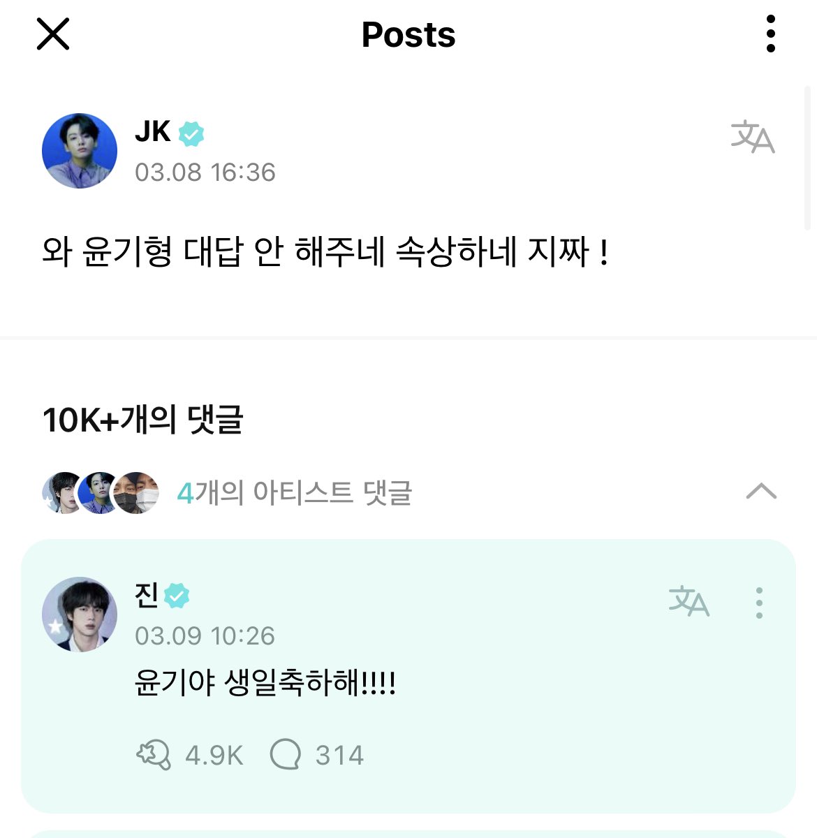 As for Jin, of course, the use of cell phones while enlisting is strict and those in the m̷i̷l̷i̷t̷a̷r̷y̷ can only use them after 6 pm. So, at around 6:30 pm, Jin immediately posted SUGA's birthday message with the content "Yoongi-ah, happy birthday" at 6:26 pm (KST).