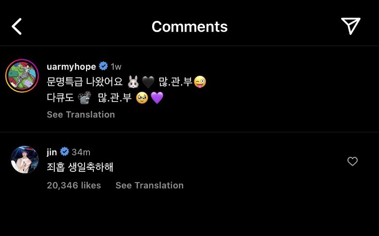 Although he did not have a separate birthday greeting, V did make an expensive comment under Jin's comment. He used the same greeting that Jin sent to j-hope and it made ARMYs laugh.