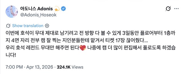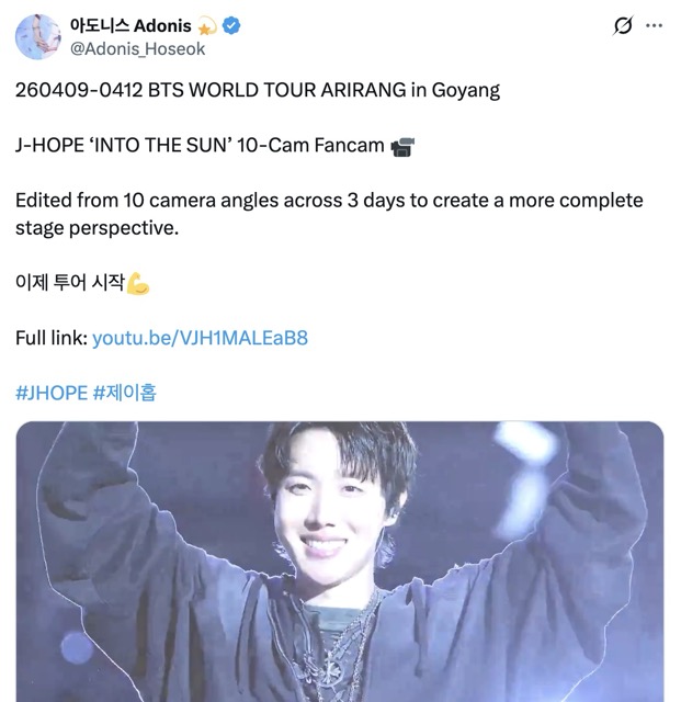 Specifically, Adonis is a long-established fansite of j-hope that has been active since 2018, known for its beautiful, high-quality photos and fancams. It is also recognized for its dedication, consistently present at most events attended by j-hope and capturing his best moments. Naturally, during the “ARIRANG” World Tour, Adonis was once again present.