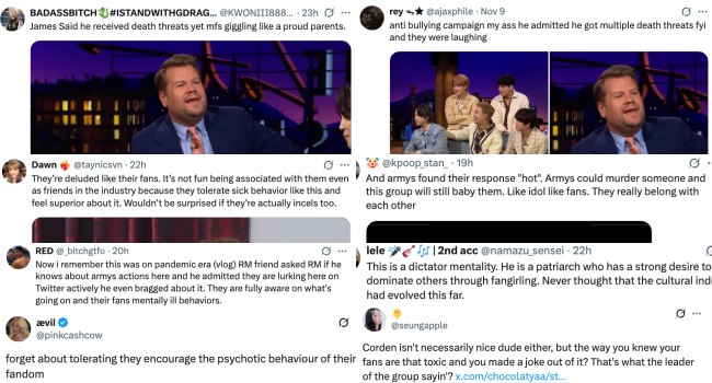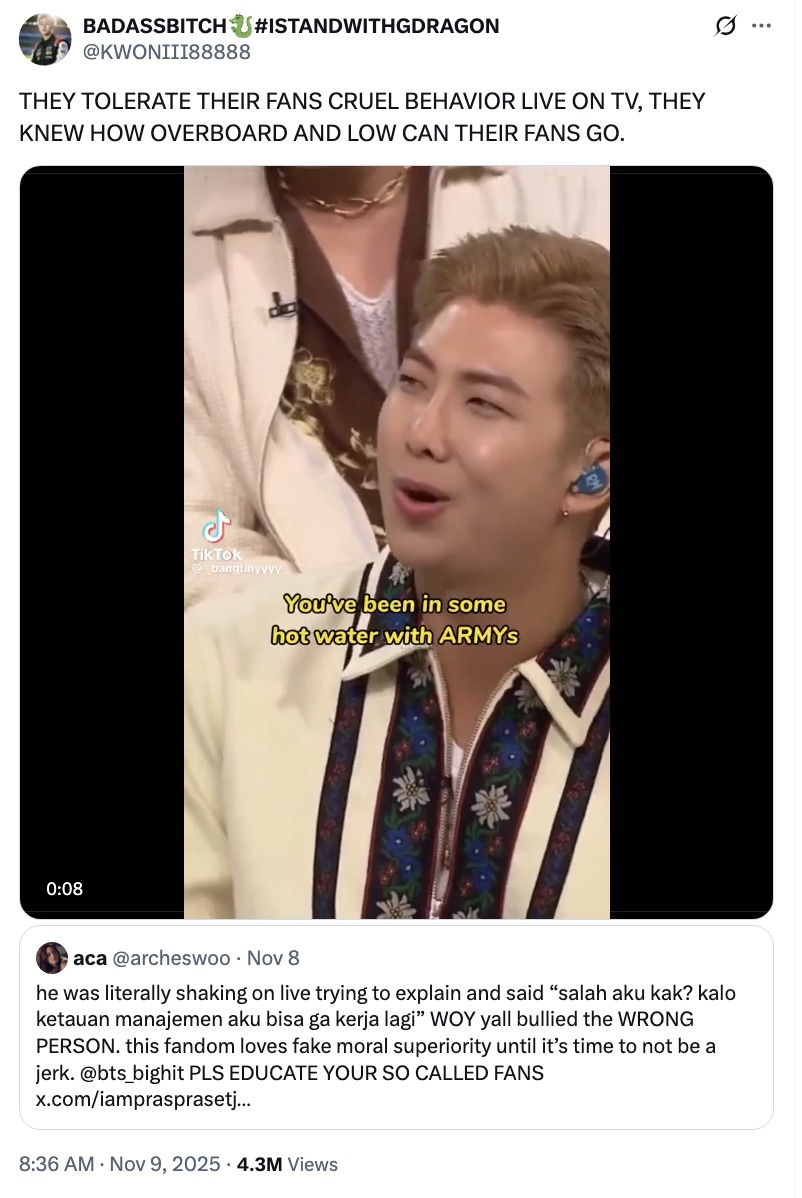 They also pointed out that the mocking attitude and loud laughter of the other members when James apologized out of fear of being threatened by ARMYs constituted a harmless-seeming complicity in terrifying hostility. These accusatory posts are now circulating widely on X with more than 4 million views, attracting thousands of comments and retweets condemning BTS and ARMYs, such as: