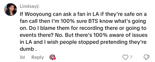 Although this issue has virtually nothing to do with BTS, they were recently dragged into the debate after a TikTok user accused the group of remaining silent about ICE raids despite working in Los Angeles at the time. The video seems to suggest that BTS should “do soмєтнing” about these raids.