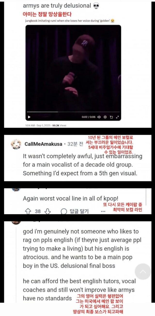 The original post first appeared on Nate Pann, claiming that: "Jungkook called ‘Golden.’ He sang so seriously bad that both кσяєαn and international fans are in chaos, but only his fans are pretending not to see and shielding him. Total live disaster from ‘Golden’ LOL Is he really the main vocalist..? The video is too funny, howww."