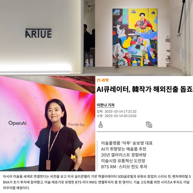 In an article titled “AI Curator Helps Korean Artists Expand Overseas,” this AI art-related project is described as being developed by the startup Habitus Associate, co-founded by Song Bo-young and Sakong Hoon. It aims to connect Asian artists with the international market and to digitize the art industry. Currently, the platform hosts over 3,700 artworks from more than 500 artists, and it is developing a resale feature to further facilitate transactions.
