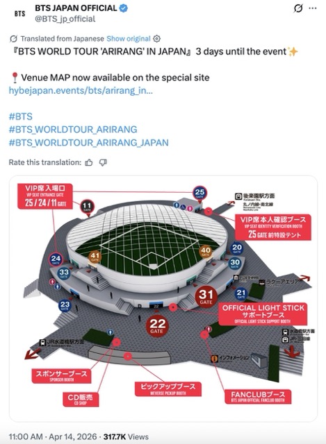 Although there are still two days left before the next concert, the excitement has already reached its peak after HYBE unveiled the first images teasing the stadium setup. Specifically, in a post titled “Only 3 days left until ‘BTS WORLD TOUR ‘ARIRANG’ IN JAPAN’,” HYBE released the venue map, providing detailed explanations of the layout, seating chart, functional zones, and entrance system surrounding the stadium.