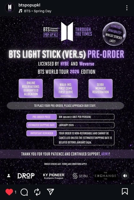 Previously, around October, rumors circulated online that “ARMY Bomb Ver.5” was about to be launched. Some shops even opened preorders with dazzling demo, labeled “BTS WORLD TOUR 2026 EDITION,” officially licensed by HYBE and Weverse, with an estimated shipping date of January 2026.