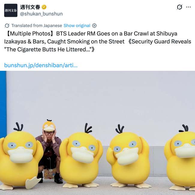 Specifically, on the 22nd, the weekly magazine Shūkan Bunshun reported that RM was spotted smoking in non-smoking areas in Shibuya, Tokyo. According to the article, while visiting several locations such as bars and izakaya, he was allegedly seen smoking in places with no-smoking signs, including on public streets.