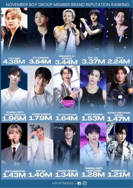 The K-pop boy group member brand reputation ranking is a monthly ranking released by the кσяєαn Business Research Institute. The brand reputation index is determined through an analysis of consumer behavior, including consumer participation, media coverage, communication, and community awareness index. Rather than being a fan vote or an evaluation by experts, the rankings are calculated based on large-scale, measurable real data, ensuring objectivity and accuracy.
