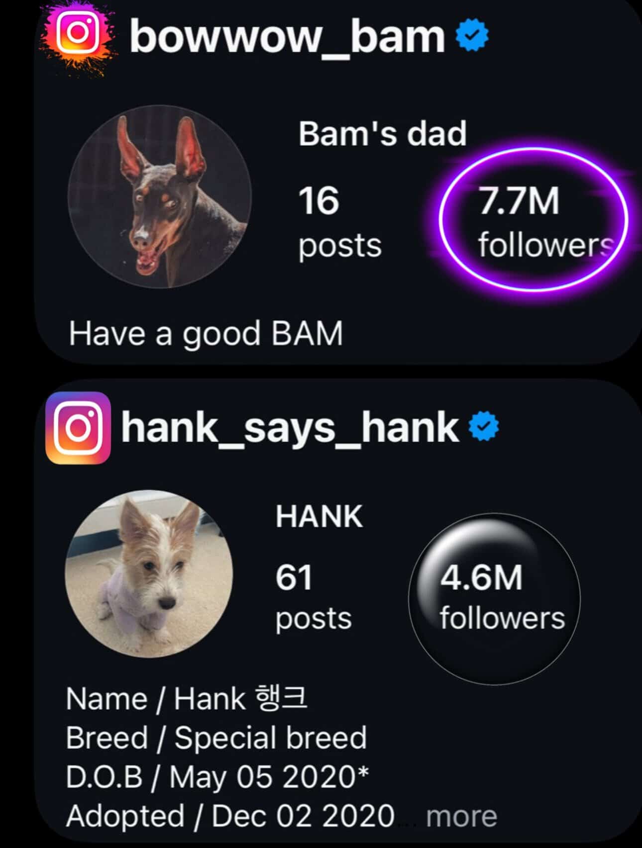 However, this is completely different from the figures shown on the Instagram accounts of the two dogs. Clearly, looking at the current follower counts, @bowwow_bam has significantly more followers than Hank (about 3 million more).
