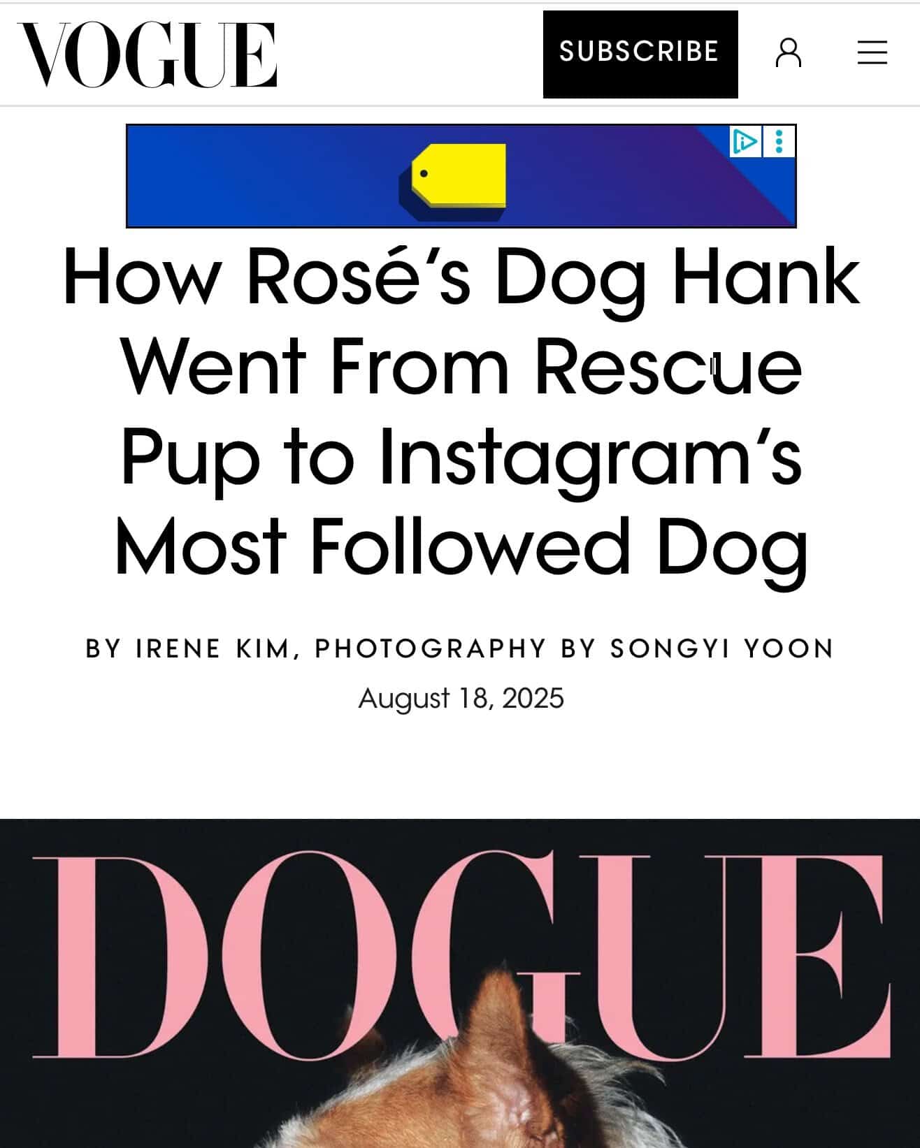 Neither of these dogs would have been dragged into a competition—since they are equally adorable—if Vogue had not published incorrect information about the title of “most-followed dog on Instagram” in that interview. Specifically, in the article “How Rosé’s Dog Hank Went From Rescue Pup to Instagram’s Most Followed Dog” released on the 14th of this month, fans noticed the title and description by the renowned magazine stating: “Today, the terrier mutt has 4.6 million, putting him at the top of the leaderboard for the most followed celebrity dog.”
