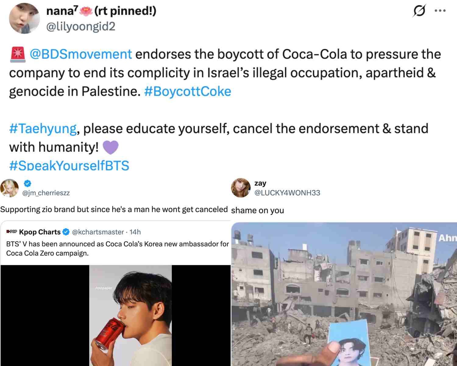 A wave of support for V exploded across social media platforms, especially Twitter and Weverse. Hashtags like #ProtectV, #VxCocaCola, and #TaehyungDeservesBetter trended in many countries with tens of thousands of shares. Fans kept emphasizing: “V has been officially announced as the new brand ambαѕѕador for Coca-Cola кσяєα in the Coke Zero campaign #BestCokeEver, an independent brand by LG H&H, and not a subsidiary of Coca-Cola USA. Coca‑Cola Company does not support any country, government or policy, political or religious belief. In this context, the claim that Coca‑Cola's income is transferred to Israel is false".