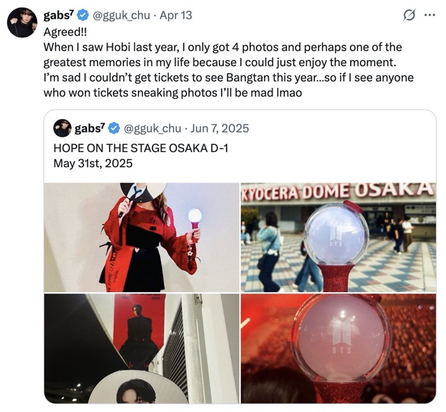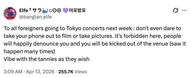 However, ahead of the concerts, several reminders from experienced fans who have attended concerts in נαραи are being widely shared to help others avoid potential violations. Specifically, a post from the account @bangtan_elfe, which has gone viral with over 250,000 views, stated: “To all foreigners going to Tokyo concerts next week: don't even dare to take your phone out to film or take pictures. It's forbidden here, people will happily denounce you and you will be kicked out of the venue (saw it happen many times). Vibe with the tannies as they wish.”