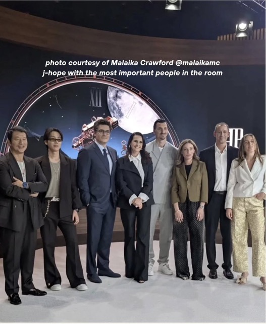 In another photo, j-hope is also seen alongside Audemars Piguet CEO Ilaria Resta, John Mayer, DIMEPIECE founder Brynn Wallner, Revolution founder Wei Koh, British Vogue’s Malaika Crawford, and football legend Zlatan Ibrahimović. This group of celebrities and influential figures is pictured in front of the luxury watch brand’s signature backdrop, appearing as if they were attending a special gathering of elite personalities for the brand’s 150th-anniversary celebration.