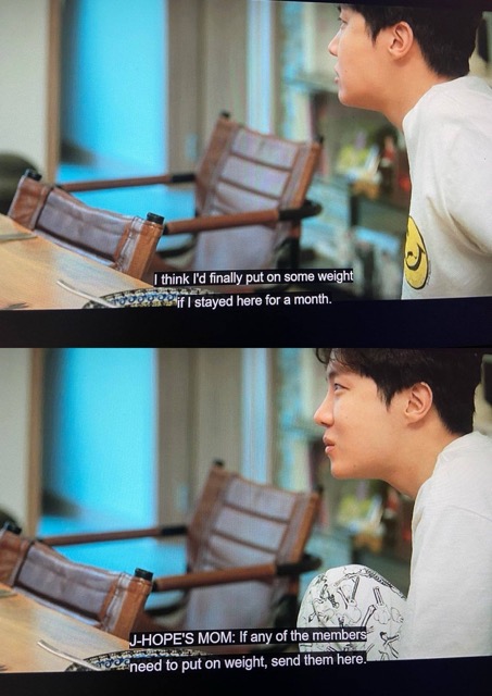 Specifically, the moment comes from an old clip when j-hope visited his family in hometown. During a meal, he told his mother, “I think I’d finally put on some weight if I stayed here for a month.” His mother smiled at his comment and warmly added, “If any of the members need to put on weight, send them here.”