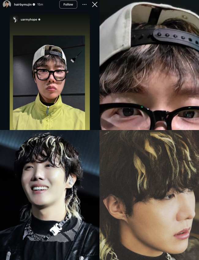 What drew even more attention was that he appeared to have just returned from the hair salon, as beneath the cap was a newly highlighted hairstyle with silver-gray streaks at the front. Renowned hairstylist Choi Mujin, who has worked with BTS members for many years, reposted j-hope’s story, indicating that he was behind the rapper’s new look.