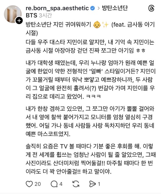 “Everyone knows Jimin as a global superstar,” the post begins, “but in my memory, the Jimin from his Geumsa-dong days was just a tiny baby toddling around”. The simple, intimate way the story is told instantly makes fanrs feel as though they are listening to a warm family anecdote.
