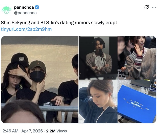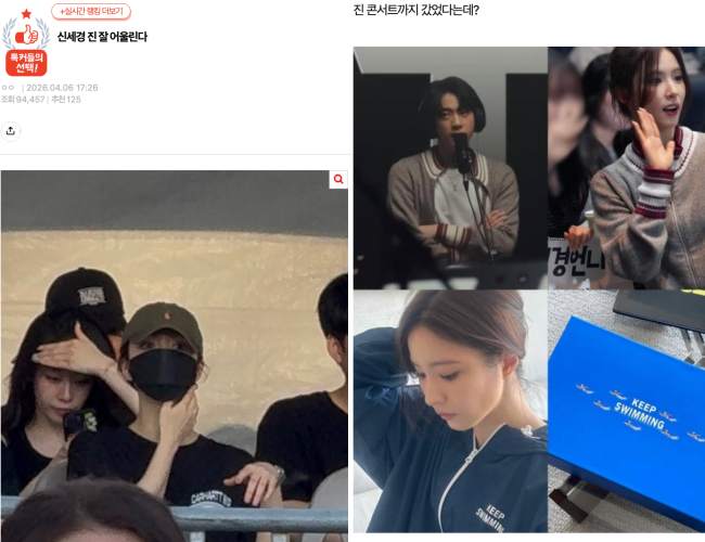 On the 7th, a post on Nate Pann garnered nearly 100,000 views, compiling additional so-called “evidence” of a relationship between Jin and Shin Se-kyung. The original poster shared several photos, such as the actress attending Jin’s solo concert in кσяєα, the two wearing the same jacket, and her receiving a piece of “Swim” merchandise—allegedly a gift from Jin. The topic was subsequently reposted and shared across social media, garnering millions of reaches.