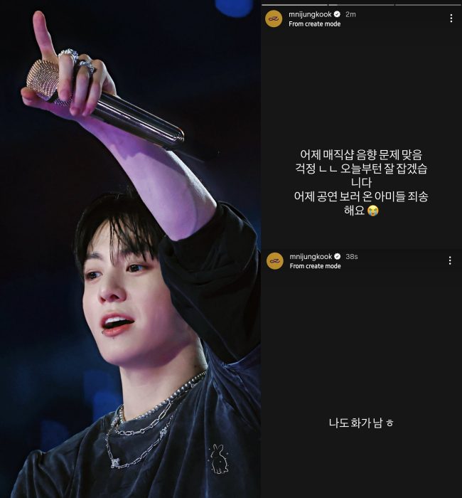 Specifically, five hours before the second show, Jungkook posted a message on Instagram stating: “It’s true there were audio issues during Magic Shop yesterday. Don’t worry. We will fix it and get it under control starting from today. I’m sorry to the ARMYs who came to see the performance yesterday.” Not stopping there, in a follow-up story, the idol also expressed his feelings: “I’m angry too lol.”