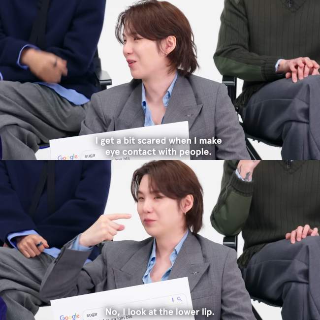 Specifically, the story began when V pointed out that SUGA is actually quite afraid of making eye contact. SUGA openly admitted that he feels “a bit scared” when looking directly into someone’s eyes. In fact, while performing the song “Hooligan,” instead of looking into the dancers’ eyes, he chose to look at their… lower lips.