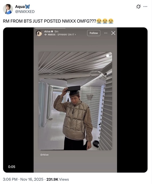 Specifically, on the 16th, RM posted a photo on his Instagram Story and attached the sound of NMIXX’s song “Spinnin on it.” This action was quickly noticed by NMIXX fans and spread across social media with overwhelming excitement. For them, the fact that a top senior in K-pop like RM enjoyed NMIXX’s song was a great honor.