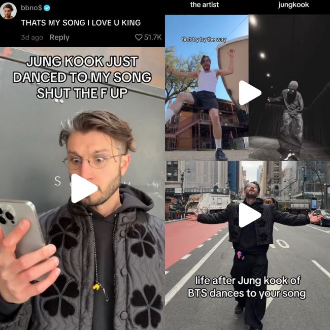Thanks to Jungkook’s influence, “Two”—a song by Canadian artist bbno$—has gained even more popularity. The artist himself immediately celebrated Jungkook of BTS taking part in his track through comments and a series of emotional reaction videos. Naturally, when artists like Jungkook or BTS use someone’s music, such reactions are expected, and ARMYs were happy for him and congratulated him.
