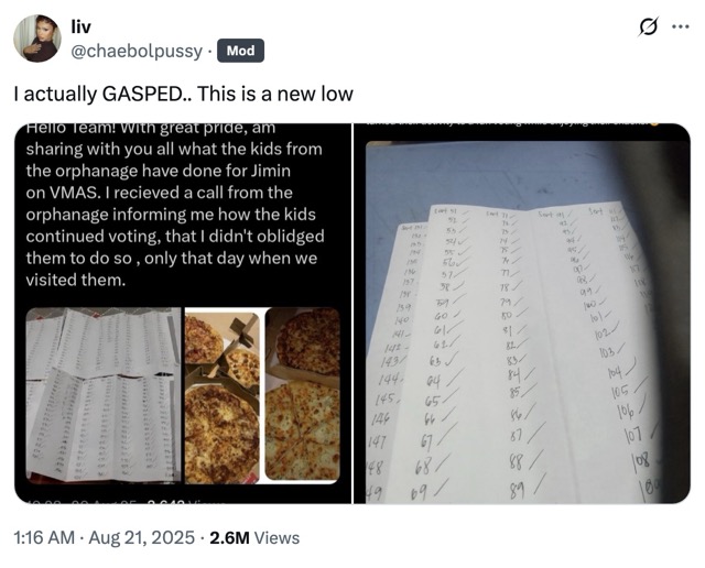 A post on X (formerly Twitter), which has since garnered over 2 million views, expressed ѕнσ¢к at the content of a tweet, calling it “a new low.” According to a screenshot, one account on X claimed they had secured additional votes for Jimin from children in an orphanage they had visited by giving out snacks.