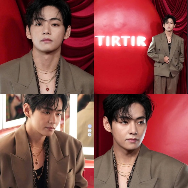 Fans and media alike were thrilled to see V in this appearance, and he certainly did not disappoint. When V entered the pop-up, he lit up the space, instantly commanding the attention of everyone present. He wore a simple brown-gray suit accented with a leopard-print detail, gold jewelry, and an unbuttoned style that made the overall outfit look fashionable and unique. His physique was perfectly showcased through the tailored fit.
