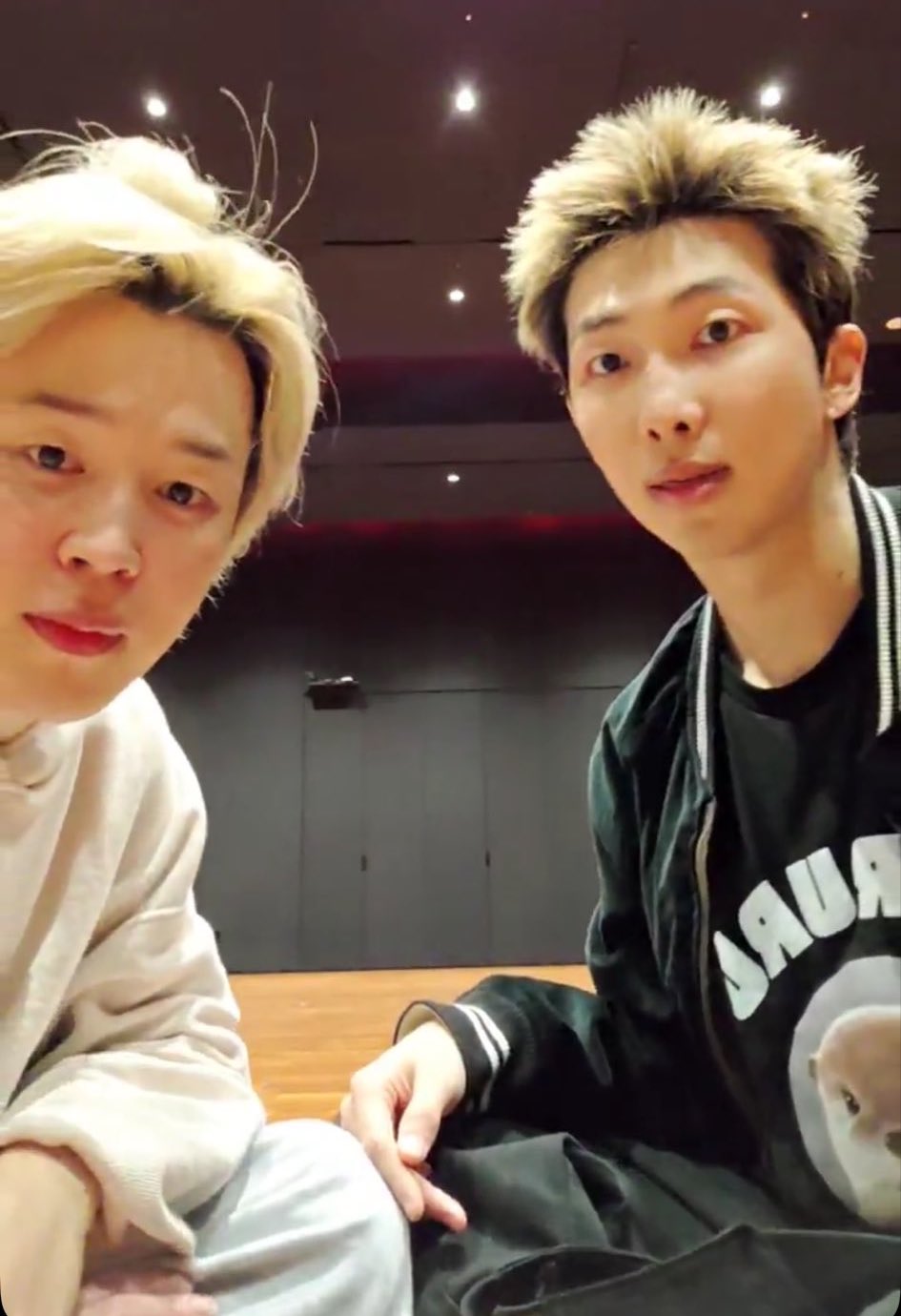 Just a few minutes ago, Jimin and RM met with fans in a short, spontaneous live broadcast. What surprised fans was that as soon as the stream started, they saw both of them sitting on the floor of BTS’s dance studio at Big Hit Music’s headquarters. The distinctive wooden floor and room layout have appeared countless times in BTS’s dance practice videos.