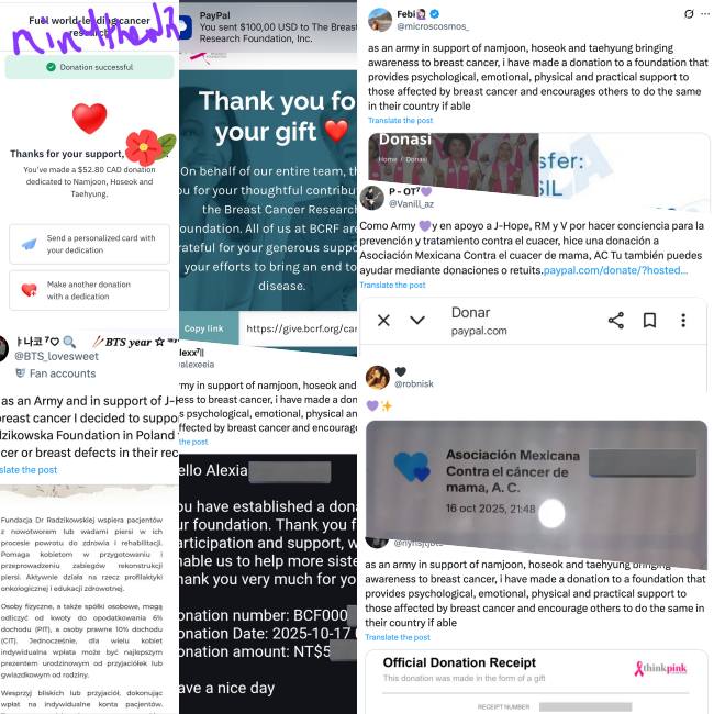 Across social media, messages such as “In support of Namjoon, Hoseok, and Taehyung raising awareness for вяєαѕт ¢αи¢єя, I also made a donation to…”, accompanied by screenshots verifying individual or group ARMY donations, have been widely shared. What began with just a few fans has now grown into thousands of individuals and fan organizations, collectively raising a significant amount of money in their local communities.