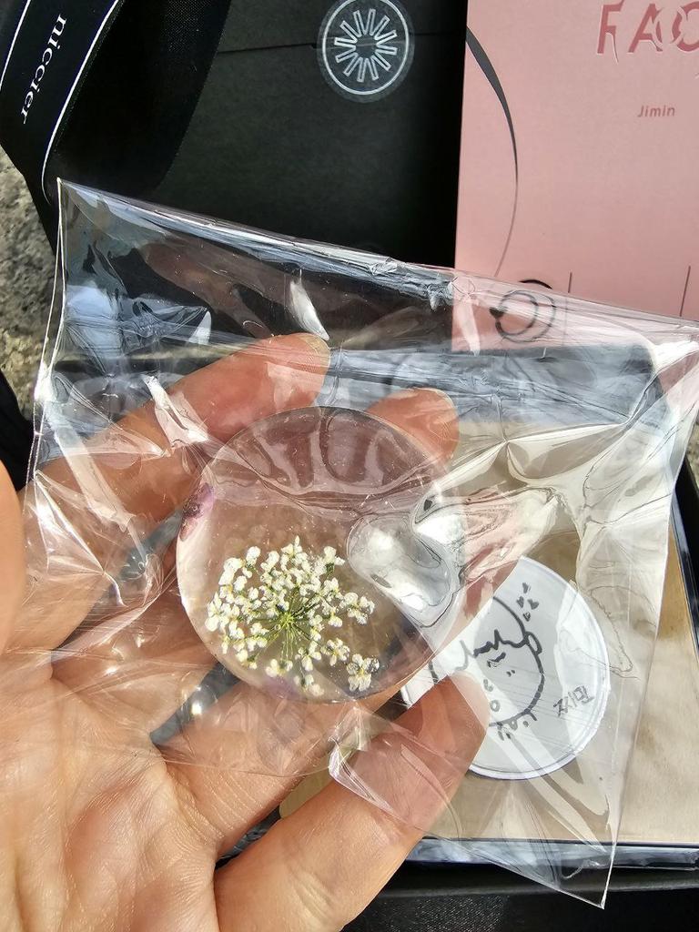 The flowers used in Jimin's gift is called 아미초 Ammi Flower, BTS often use this flower because it has the same hangul as ARMY (AMI). Jimin seemed to have used this flower as referring to his fans and it was a gift for ARMYS. That is really sweet!