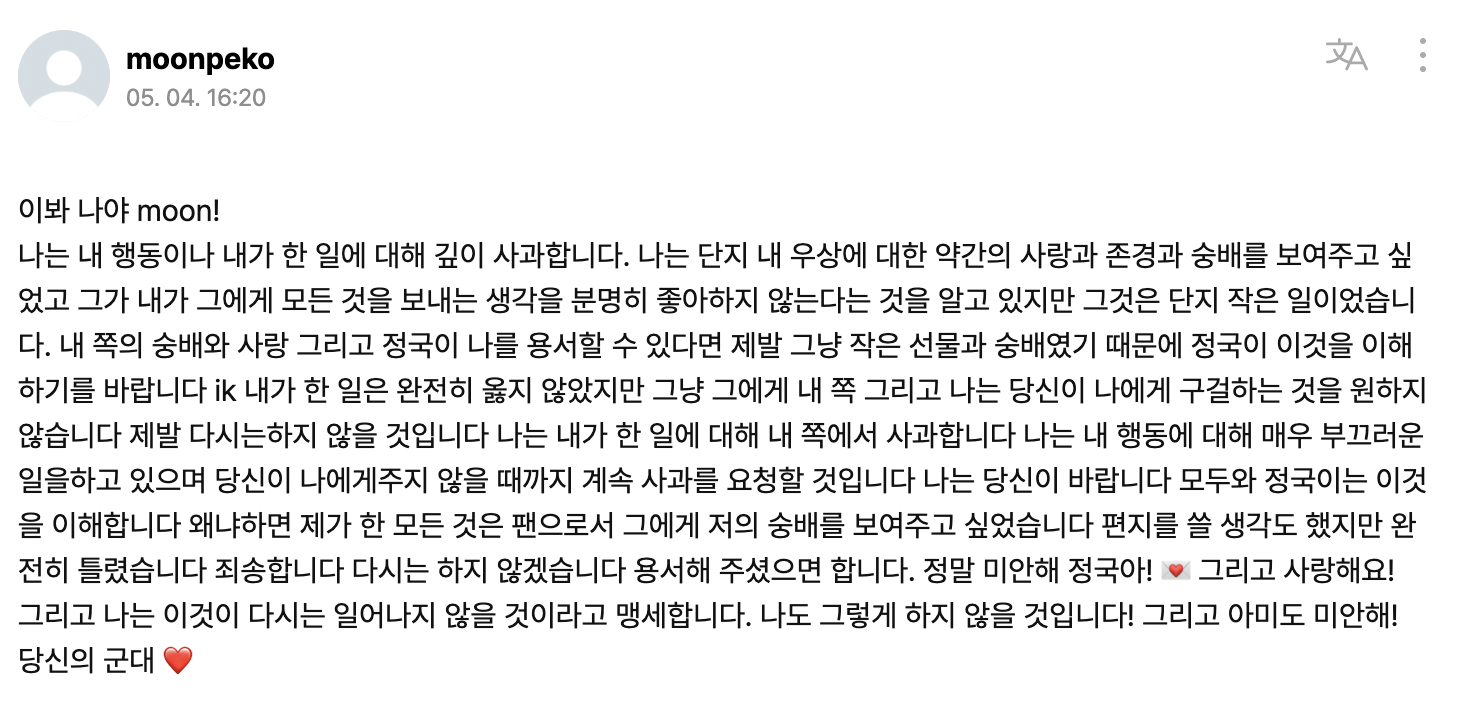 This person wrote: "hey its me moon! i deeply apologies for my behavior or for what i have done i just wanted to show some love and respect and my adoration towards my idol and i know this that he clearly dint like the idea of me sending him all these. But that was just a lil adoration and love from my side and if jungkook could forgive me then please because it was just as a lil gift and adoration. I hope jung-kook understand this ik the thing i did was totally not right but i just wanted to gift him som̾e̾t̾h ̾ing from my side and i dont want you to beg me please i wont do it again i apologies from my side for whatever i have done.