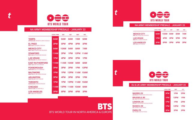 In South кσяєα, tickets will be distributed exclusively through NOL Ticket. Meanwhile, Ticketmaster will serve as one of the primary ticketing platforms for BTS WORLD TOUR shows in the United States, ¢αиα∂α, мєχι¢σ, Europe, and the United Kingdom. To purchase presale tickets, fans must hold an ARMY Membership and complete membership verification on NOL Ticket or Ticketmaster before the designated ∂єα∂line. The specific timeframe is as follows: