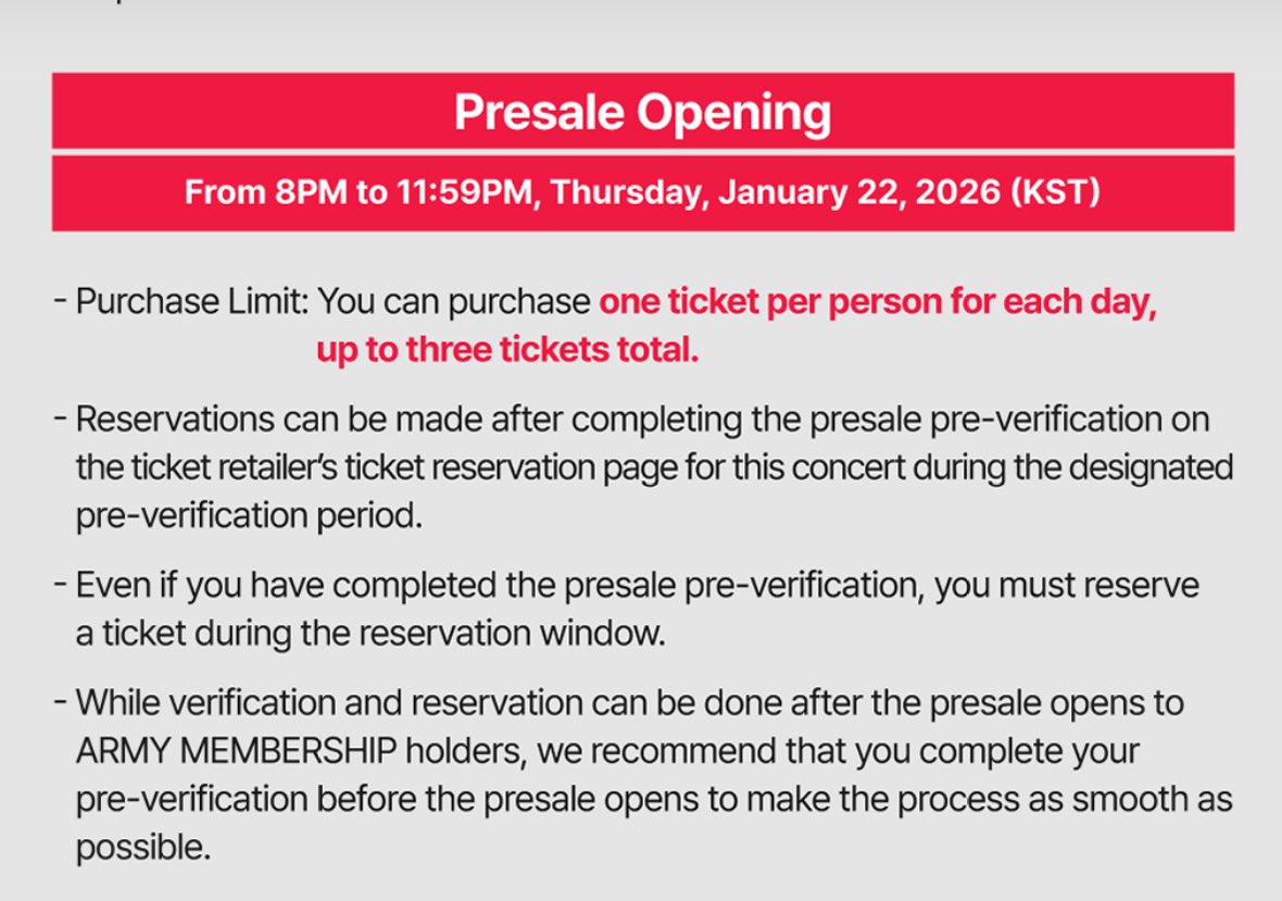 Importantly, ticket sales will take place in two phases: a presale for verified ARMY members, followed by general ticket sales.