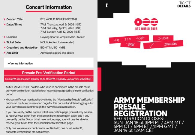 This presale represents the earliest opportunity to secure a chance to see the seven members in person, making it essential for fans to complete ARMY Membership registration as early as possible to take advantage of this priority. However, those who miss out on presale can still try their luck during the subsequent general sale, although competition is expected to remain intense.
