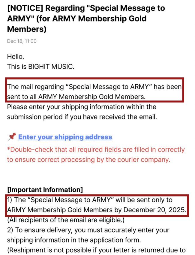 However, while some fans excitedly showed off their emails, others grew anxious after realizing they had not received a similar notification, despite also being annual members. Before long, as confusion spread, Weverse posted an additional notice just a few hours after the emails were sent. A crucial note immediately caught fans’ attention: only members who qualify as GOLD MEMBERS are eligible to receive the physical letter.